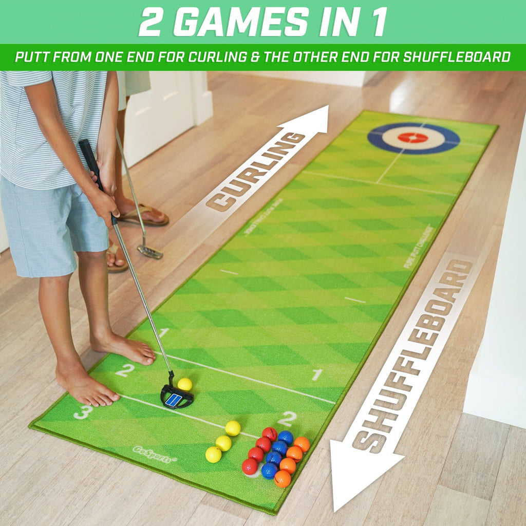 PURE PUTT CHALLENGE: Shuffleboard & Curling meets golf in this 2-in-1 putting game! Full game includes 1 premium 10ft putting rug with Curling on one end and Shuffleboard on the other, 16 Golf Balls and Dry Erase Scorecard