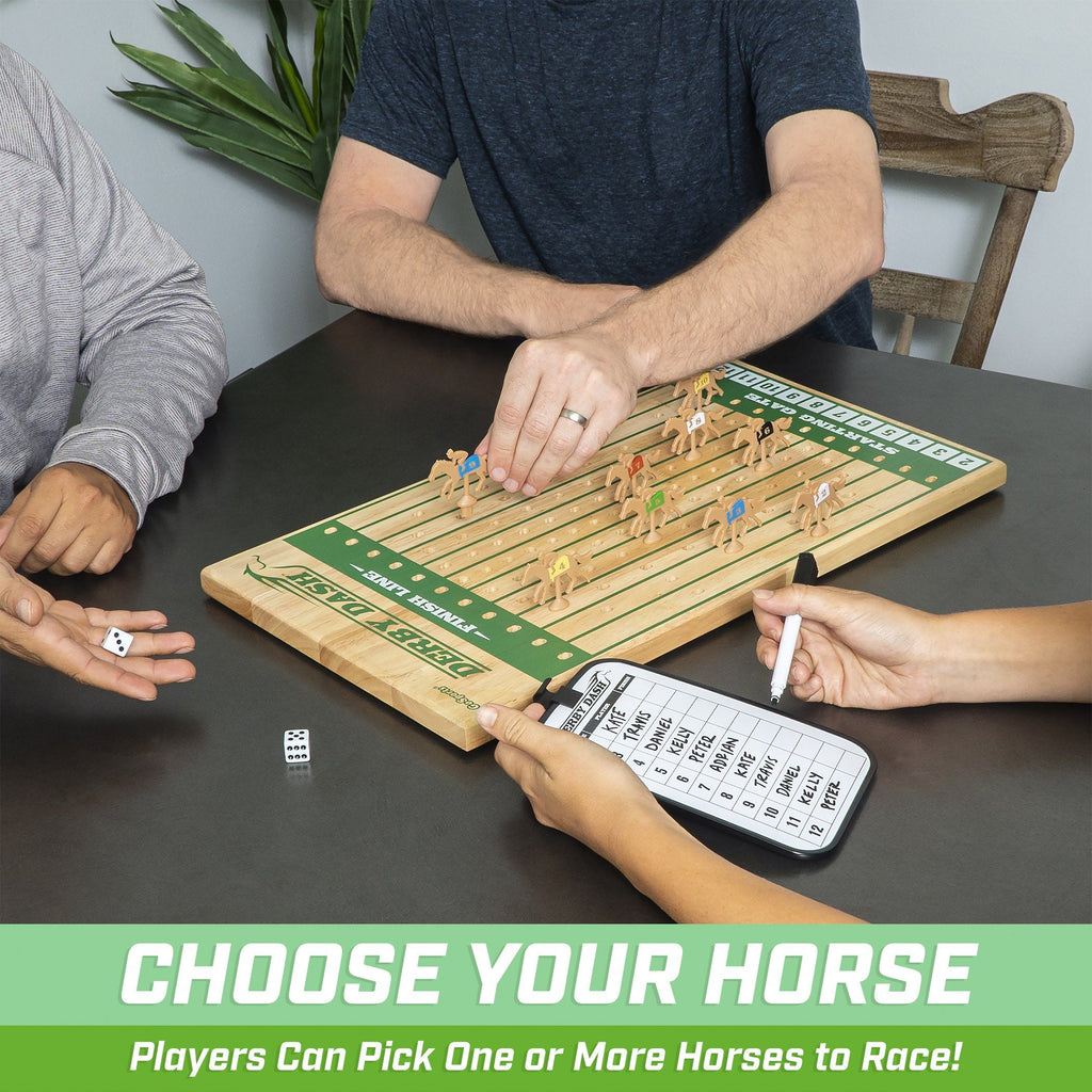 Race to the finish with GoSports Derby Dash! Raise the stakes with this exhilarating game of chance that will have players on the edge of their seats as horses dash to the finish with every dice roll to be crowned the winner. Make your next game a day at the races with GoSports Derby Dash!