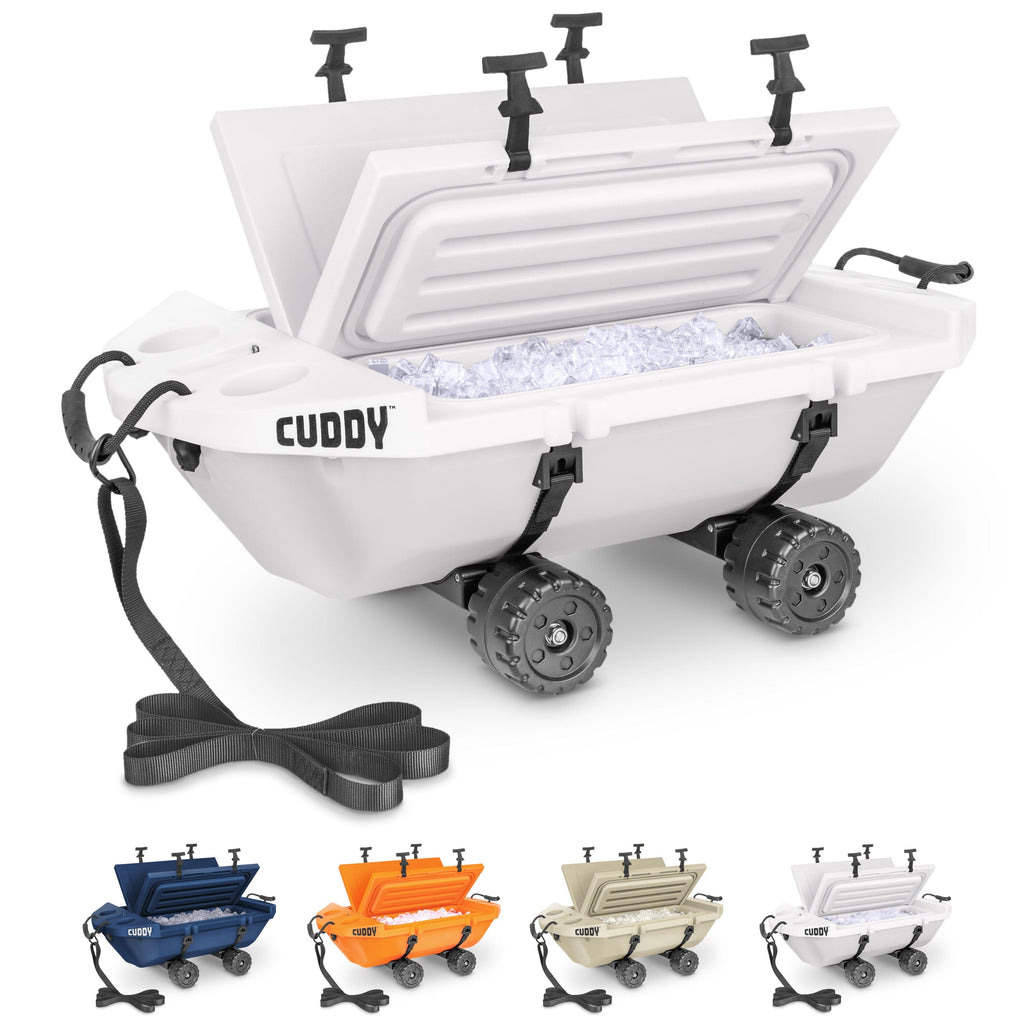 Cuddy 40 QT Floating Cooler and Dry Storage Vessel with Cuddy Crawler Wheel Kit - White GoSports four panel displaying cooler with wheels pulled on all terrain