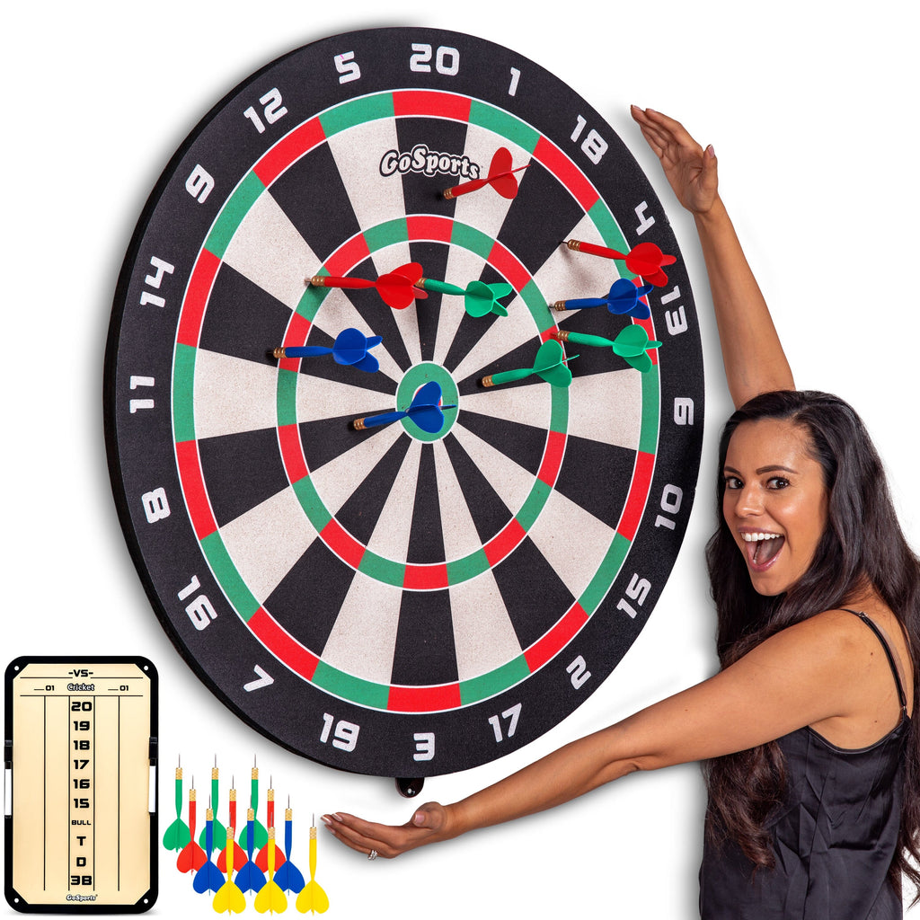 Take darts to the next level! GoSports Giant Dartboard plays just like standard darts but on a giant scale. The extra-large board is constructed from a 1/2 inch thick cork board with a solid wood backing to withstand countless throws and protect your wall. Includes all hardware for easy wall mounting and detailed instructions for a quick setup. The Giant Dartboard set comes with 4 sets of steel-tipped darts (3 red, 3 green, 3 blue, 3 yellow), a dry-erase steel scoreboard, and 2 magnetic markers. The larger target is great for all skill levels and makes a great addition to any game room or garage. Challenge friends and family to a game of giant darts with GoSports Giant Dartboard!