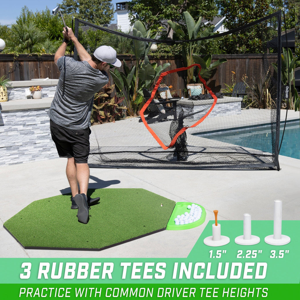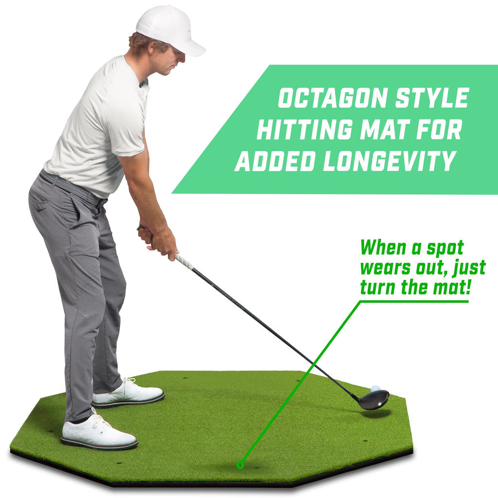 The GoSports 5 ft x 5 ft Octagon Golf Hitting Mat is an elite training tool that provides the perfect platform for golfers of all abilities to perfect their swing. The octagon shape is designed to maximize the lifespan of the mat, so you can get the most out of your turf. Simply rotate the mat and hit from one of the 8 different tee positions as one side begins to wear. The mat also includes 3 rubber tees with varying heights (1.5 inch with tee holder, 2.5 inch, and 3.25 inch) so you can practice any shot! Now you don't have to sacrifice your lawn or hope for perfect golfing weather. The ready-to-go mat lets you save your lawn when practicing outdoors and is a great addition to any indoor garage or basement setup for year-round practice. We engineered our golf hitting mat to withstand thousands of swings and practice hours, making it ideal for the golfer on the go. Sharpen your golf skills anytime anywhere with the GoSports Golf Hitting Mat!