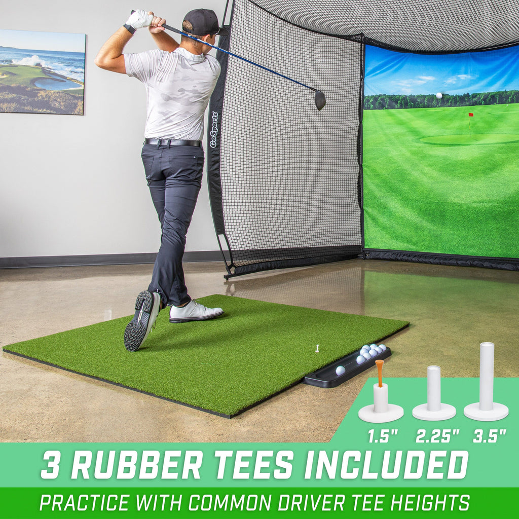 The GoSports Golf Hitting Mat encompasses everything an experienced or growing golfer needs to perfect their swing. GoSports also includes 3 rubber tees with varying heights (1.5 inch with tee holder, 2.5 inch, and 3.25 inch) so you can practice any shot! Now you don't have to sacrifice your lawn or hope for perfect golfing weather. The ready-to-go mat lets you save your lawn when practicing outdoors and is a great addition to any indoor garage or basement setup for year-round practice. We engineered our golf hitting mat to withstand thousands of swings and practice hours, making it ideal for the golfer on the go. Sharpen your golf skills anytime anywhere with the GoSports Golf Hitting Mat!