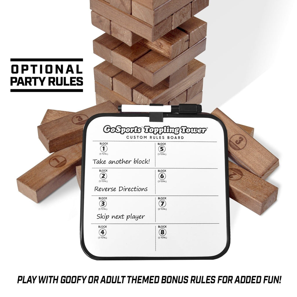 The set is made out of pine wood blocks with smooth sanded edges for seamless gameplay and is hand-stained for a classic finish. The Tower starts at 1.5 ft tall and can grow to over 3 ft during games. The object is to pull blocks out of the body of the tower and replace them at the top without the tower falling over. Our set also features printed numbers on some of the blocks. These numbers correspond with a special set of rules that make the game even more fun! For example, you may pull a block and then see it has the #6, this would mean you follow the # 6 rule, which can be anything you want (skip your next turn / reverse order / draw another block / etc). The rules sheet is a dry-erase board so you can create your own rules. You can make the rules adult-themed or goofy. The game includes a robust canvas carrying case so you can neatly store the set or bring it with you anywhere.