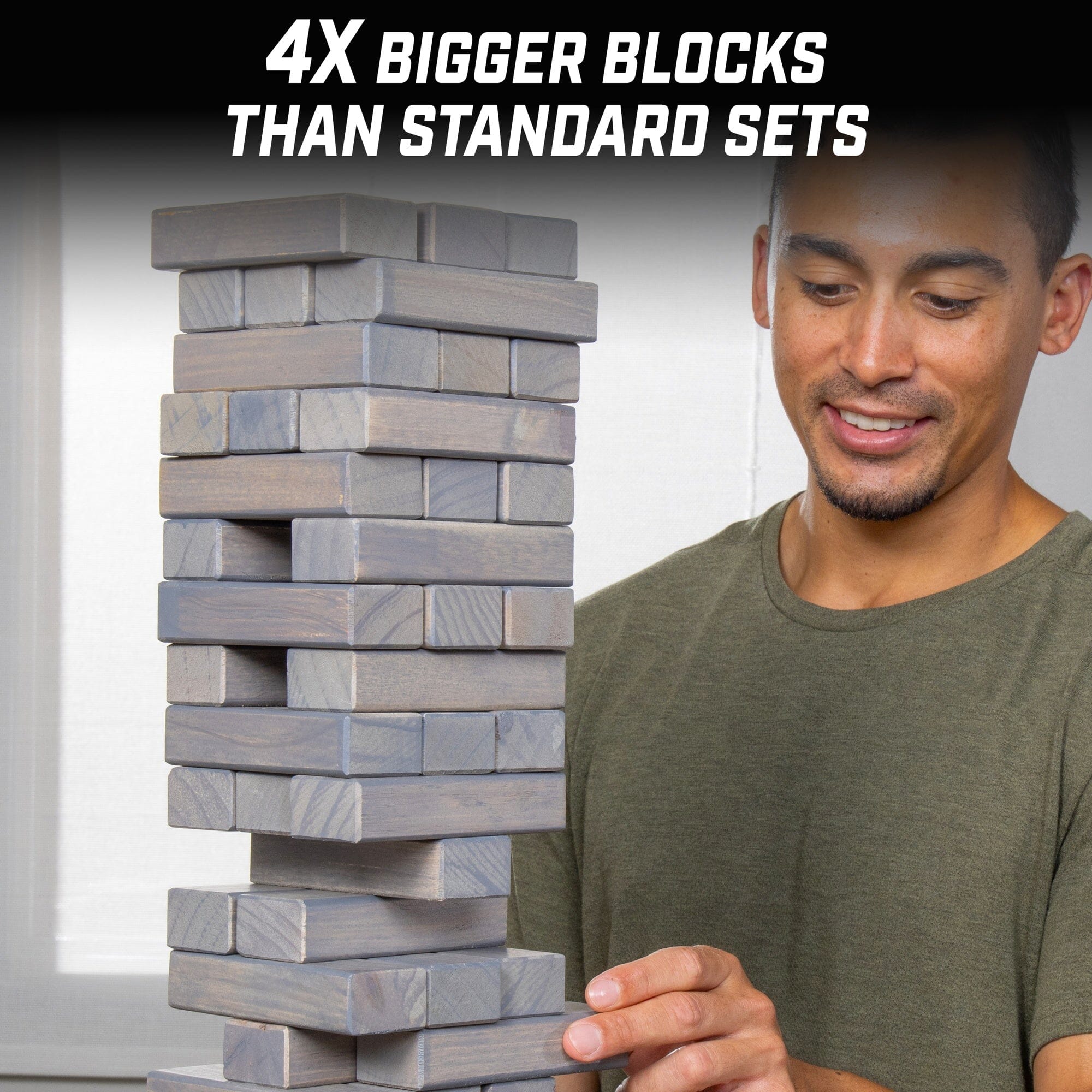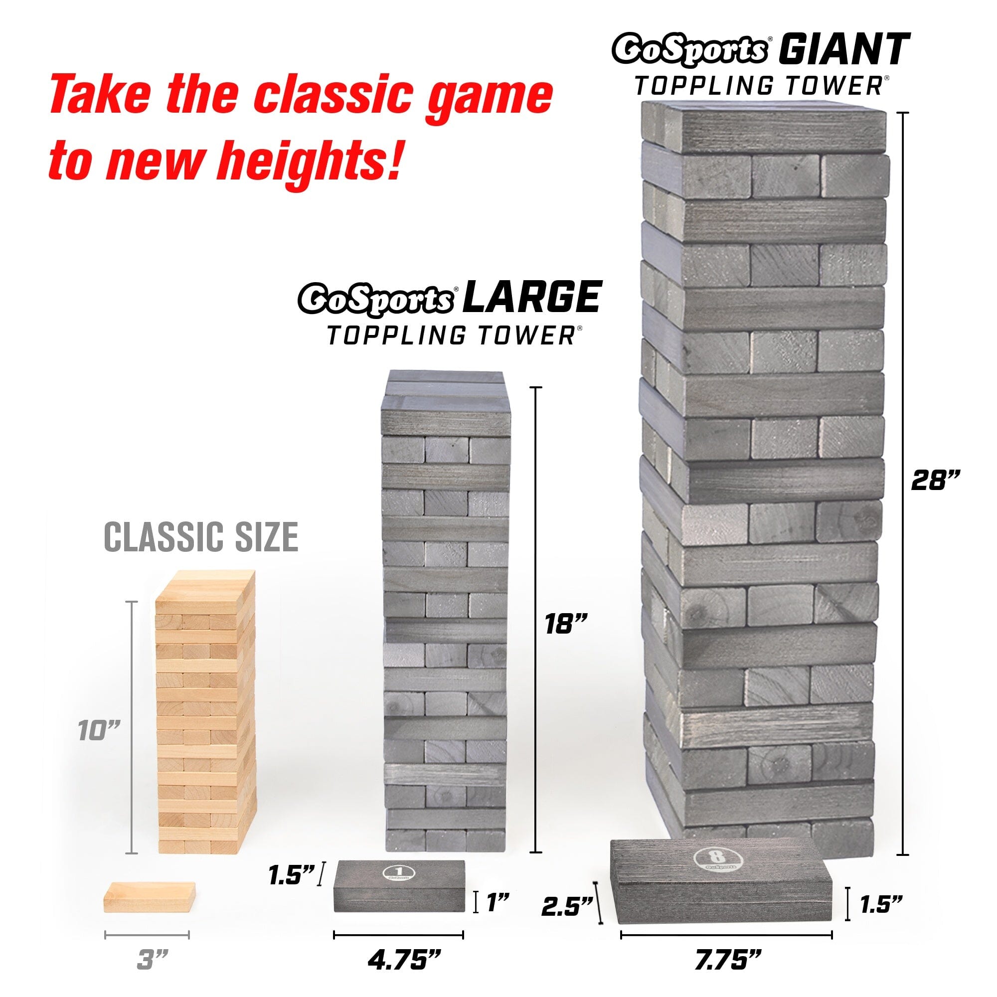 - LARGE SIZE: Starts at 1.5 ft tall and grows to over 3 ft, that is 2x larger than standard sets; Includes 54 giant blocks (18 rows), carrying case and custom rules board