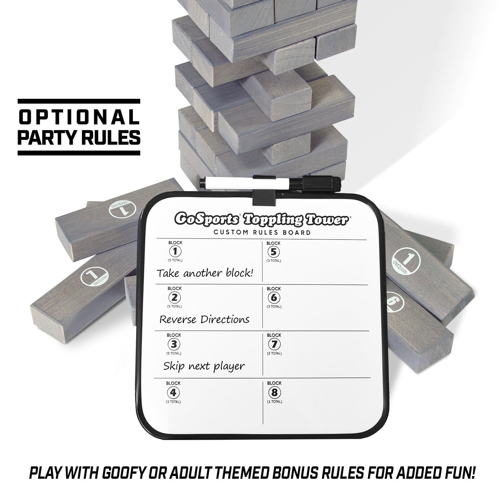 - DRY ERASE BOARD: Make your own optional party rules — goofy rules, adult themed rules, and more