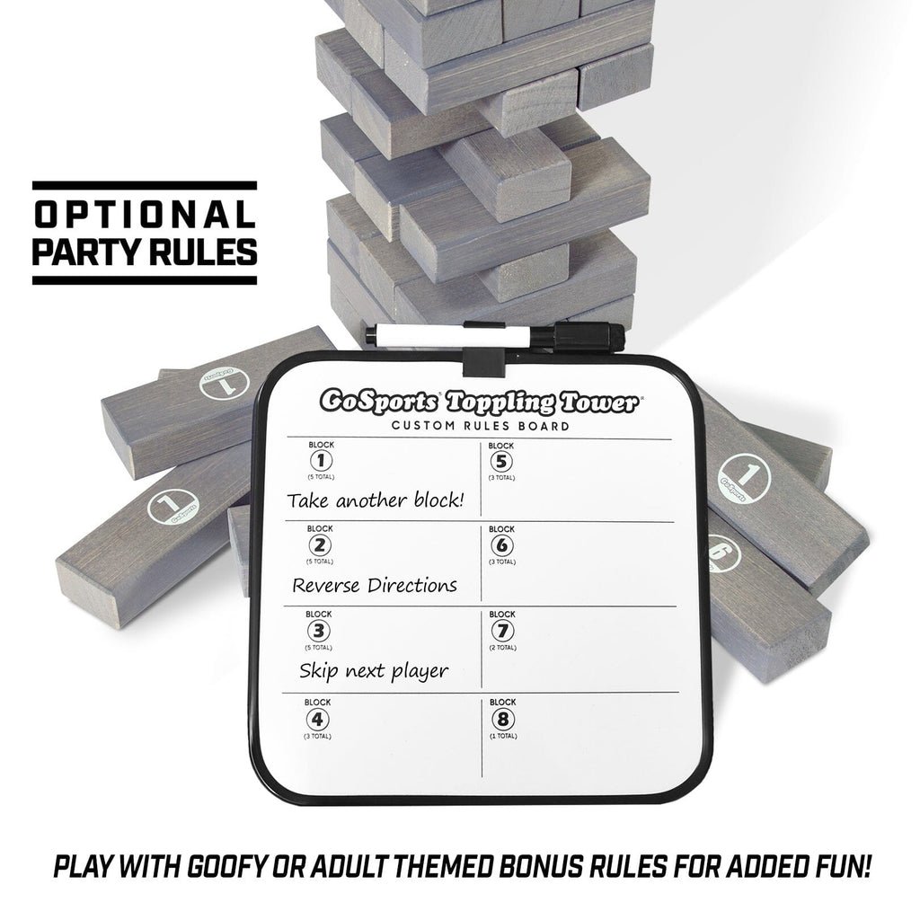 The set is made out of pine wood blocks with smooth sanded edges for seamless gameplay and is hand-stained for a classic finish. The Tower starts at 1.5 ft tall and can grow to over 3 ft during games. The object is to pull blocks out of the body of the tower and replace them at the top without the tower falling over. Our set also features printed numbers on some of the blocks. These numbers correspond with a special set of rules that make the game even more fun! For example, you may pull a block and then see it has the #6, this would mean you follow the # 6 rule, which can be anything you want (skip your next turn / reverse order / draw another block / etc). The rules sheet is a dry-erase board so you can create your own rules. You can make the rules adult-themed or goofy. The game includes a robust canvas carrying case so you can neatly store the set or bring it with you anywhere.