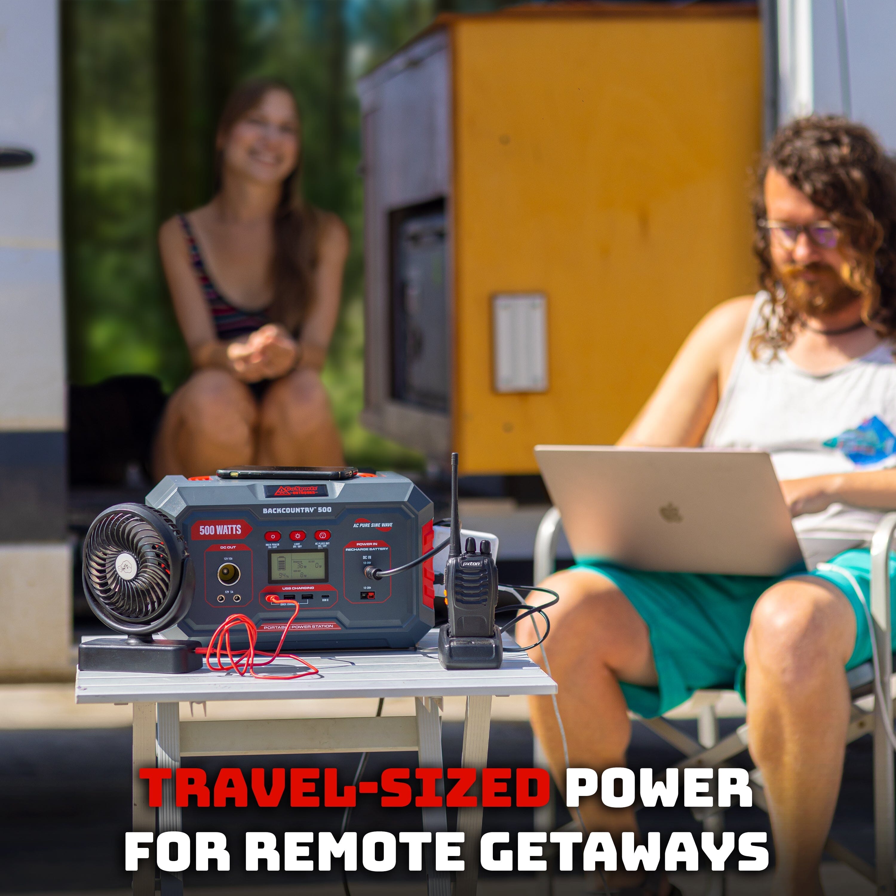 The GoSports Outdoors Backcountry 500W portable power station was designed in the US by outdoor enthusiasts for outdoor enthusiasts. The compact, yet mighty and rugged design, can power and charge devices for planned outdoor adventures and even unplanned home emergencies. The Backcountry features 3 easy ways to recharge: AC, DC or Solar (free unlimited green power!) and you can charge or power your devices using the 2 AC outlets, 3 USB 3.0 ports, 1 USB-C port and a wireless phone charger. Popular devices to charge and power are: power tools, gaming consoles, lights, computers, phones, drones, cameras, speakers, projectors, medical devices, TVs, mini-fridges, blenders and more. Included is a detailed user guide with tips on how to use the Backcountry portable power station, and how to charge and power your favorite devices. Thank you for keeping American brands alive by supporting GoSports Outdoors!