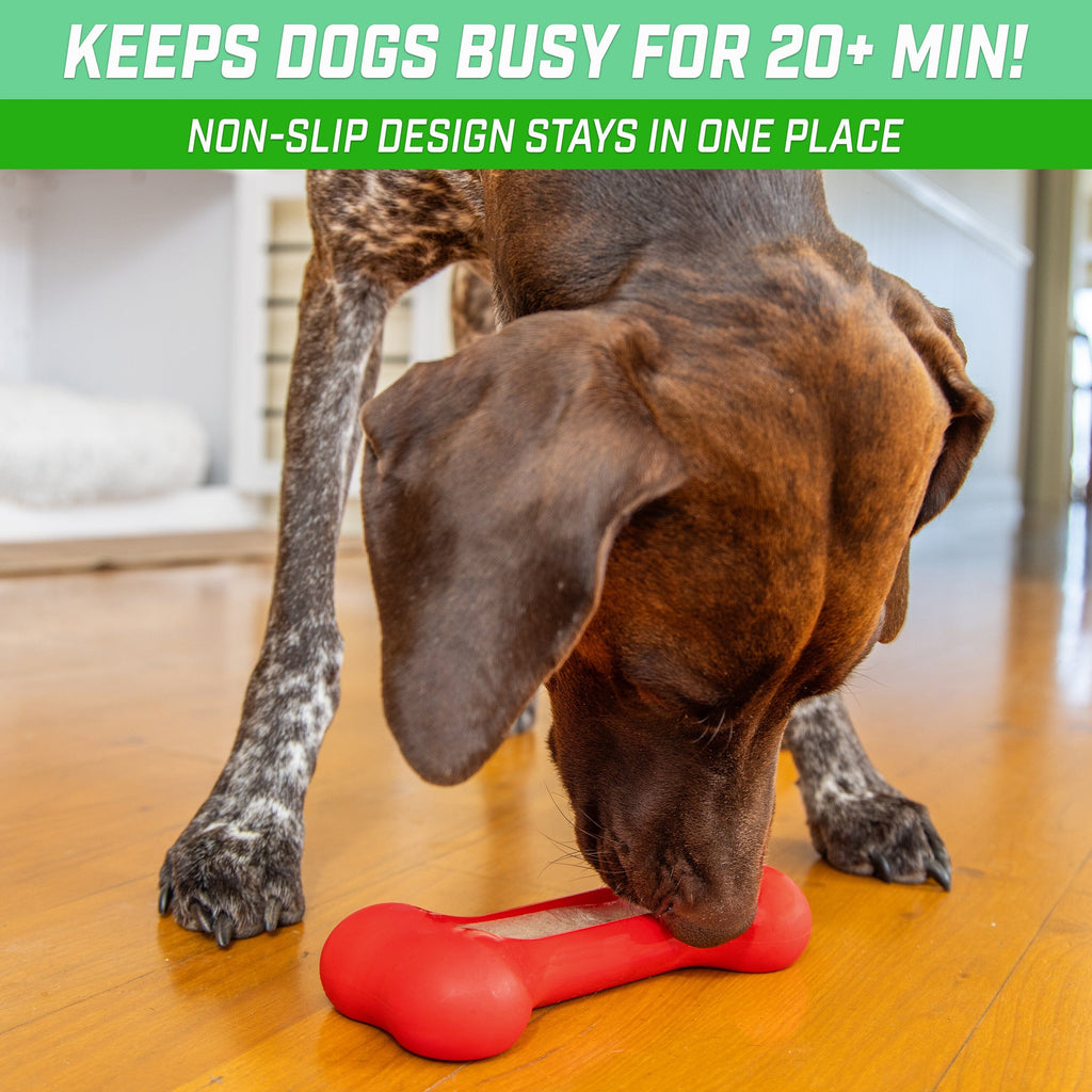 - KEEP DOGS BUSY: Fun 20+ minute activity; Fill & freeze with healthy snacks like broth, yogurt, peanut butter, & more; Designed to stay in place to prevent eating on the floor, couch, or bed