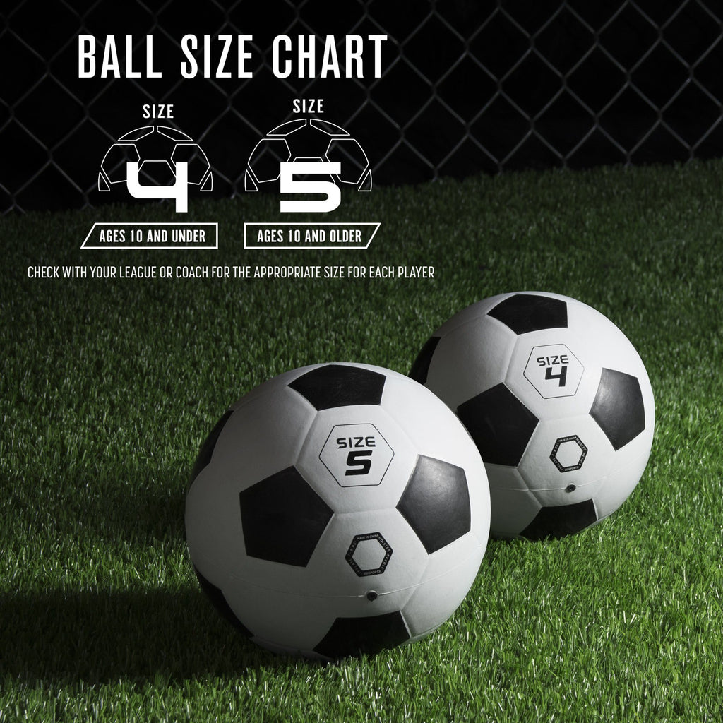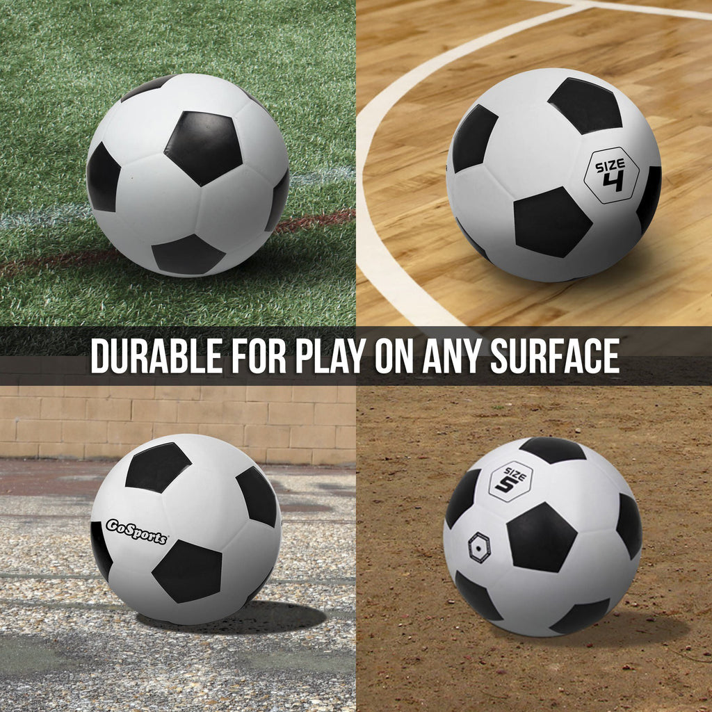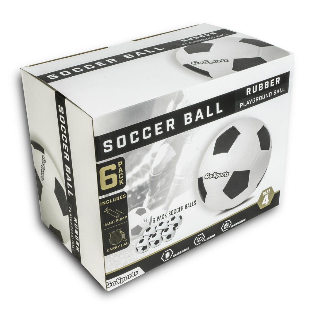 The premium all-rubber, all-weather design of the GoSports Rubber Soccer Balls is miles ahead of the competition. The careful construction incorporates durable rubber for ball longevity and use on any surface, which makes it an ideal choice for anyone looking for long lasting value. Taking the game off the grass and onto synthetic turf or concrete has also never been easier. That's what makes the GoSports Rubber Soccer Balls so dependable and the clear winner for schools, families, camps, and coaches. It features the classic black and white soccer ball design with all the modern features intended to provide great all-around recreational use for beginner level players. As an added value, this 6 pack includes a premium ball pump to always maintain optimal air pressure and a sturdy mesh tote bag to hold all 6 balls.