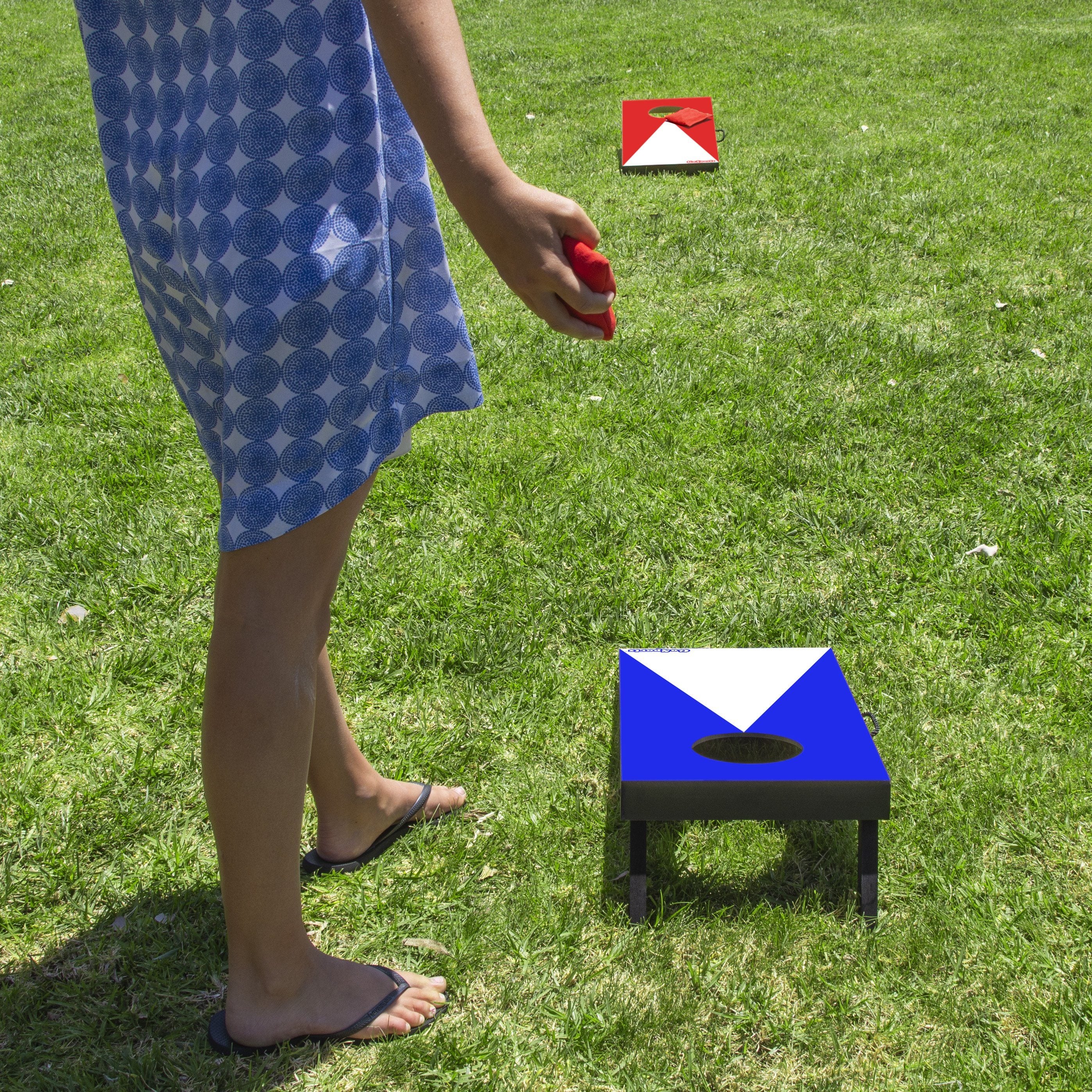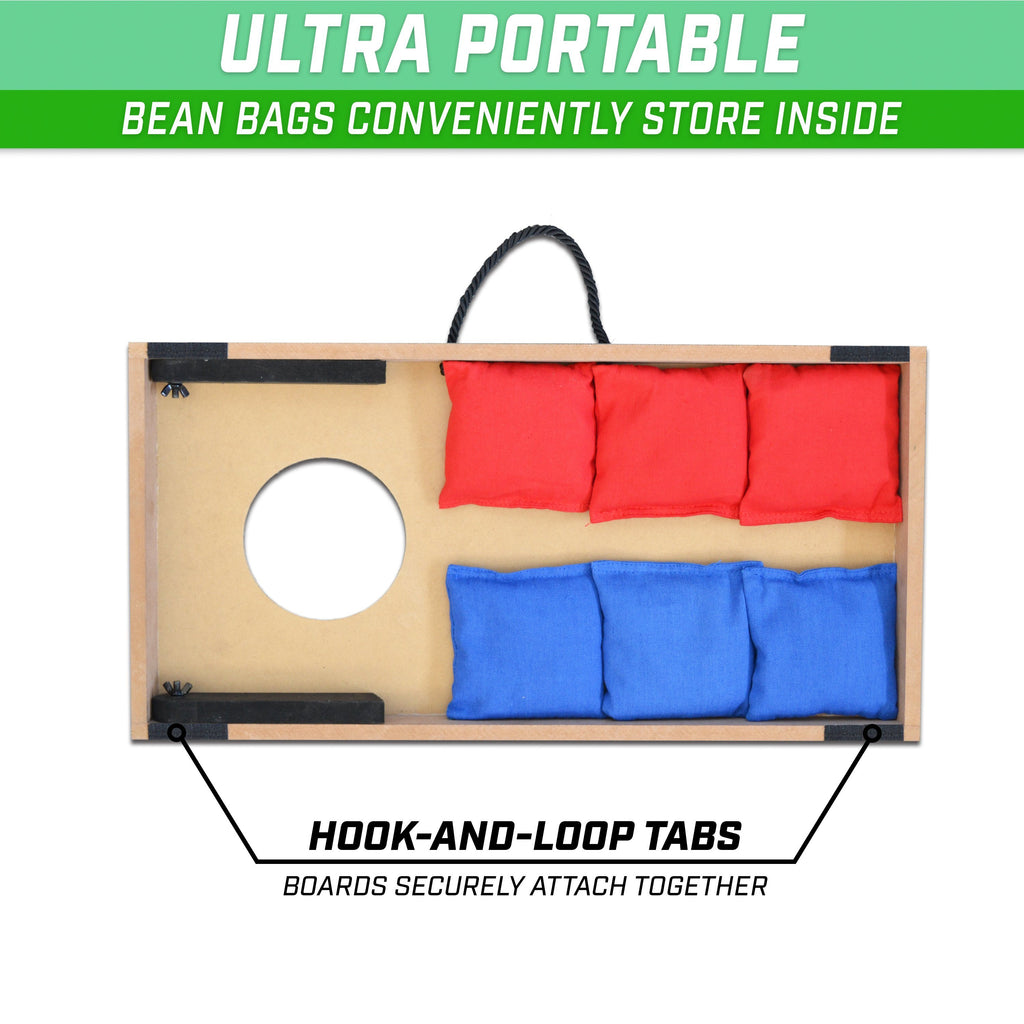 Enjoy classic bean bag toss anywhere with a portable set designed for quick setup, easy storage, and hours of active fun. The scaled-down boards pack all the excitement of traditional gameplay into a compact format ideal for indoor and outdoor use. Built from durable, lightweight MDF with a slick vinyl surface, this set includes 6 premium duck cloth bean bags for 2- or 4-player games. When you’re done, simply hook-and-loop the boards together, stash the bags inside, grab the built-in handles, and go. Aim for the board to score 1 point or sink the hole for 3 points—full rules and instructions included. Great for family game nights, tailgates, picnics, dorm hangouts, and office breaks.