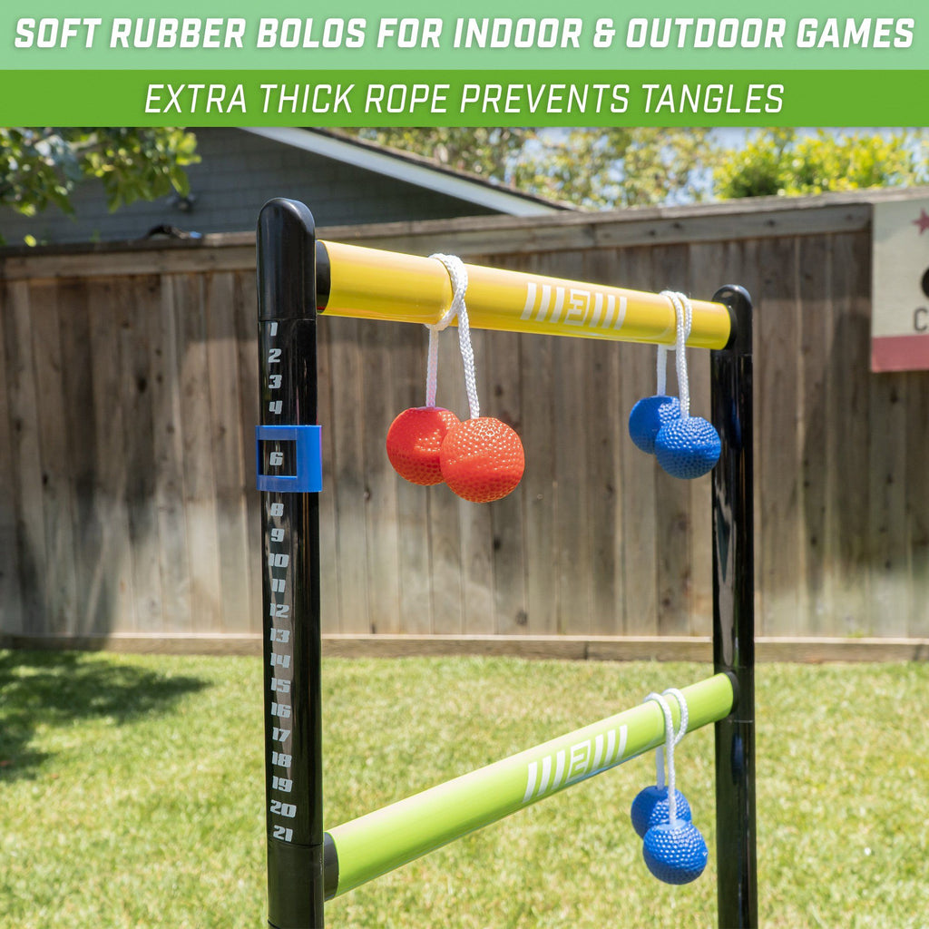 - COMPLETE SET: Includes 2 pro grade ladder toss targets with score trackers, 6 soft rubber bolos (3 red + 3 blue), carrying case and rules