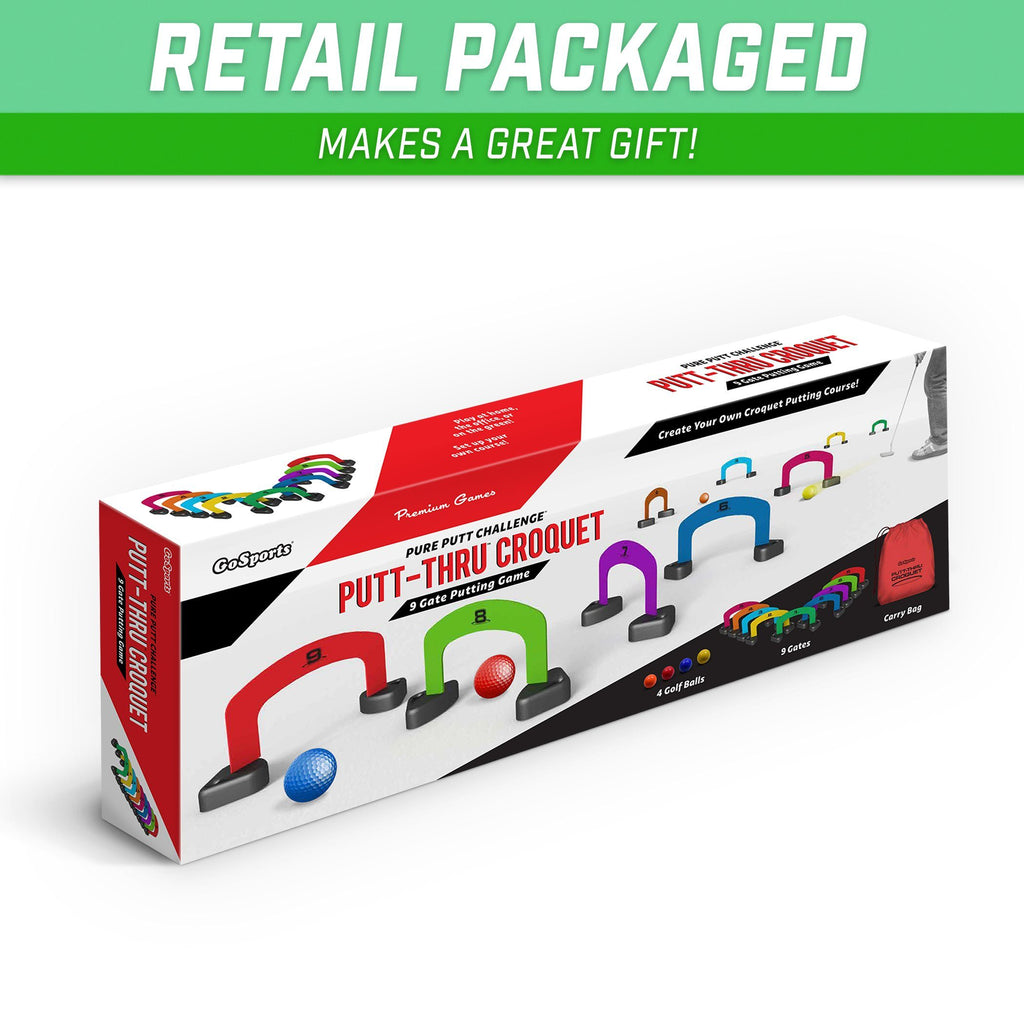 • PUTT-THRU CROQUET: An exciting new golf putting game mixed with the classic fun of croquet; Full game set includes 9 gates, 4 golf balls and carry bag