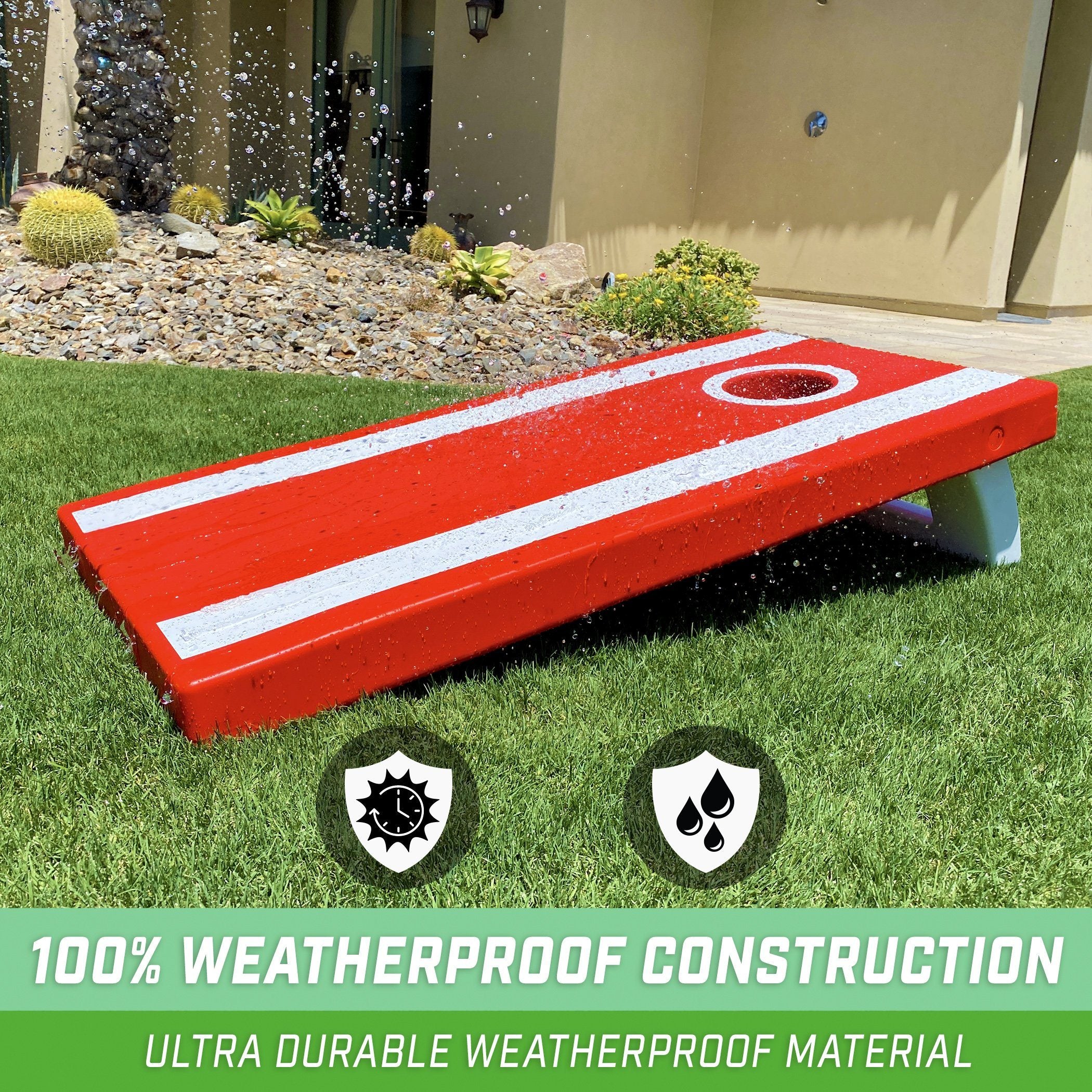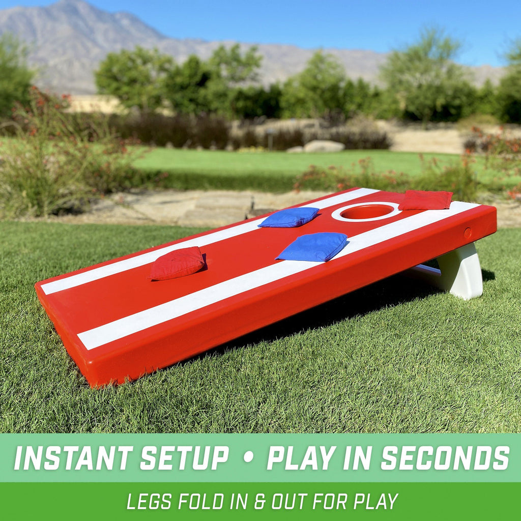The GoSports All-Weather Cornhole game set was designed to provide for a superior cornhole experience by maximizing durability, portability, and game quality. The 4 ft x 2 ft boards are full regulation size for authentic gameplay, but they are made from durable yet lightweight hard plastic to make them portable. Premium materials help make this set a leader in the cornhole market in terms of durability and price. The set also includes 8 all-weather duck cloth bags, not the cheap sand filled bags other companies use that feel like bricks. Our boards are also unique in that the base leg folds in for easy portability/storage, but this does not affect gameplay in any way. All the bags can be stored inside the folded boards when not in use. Choose from our fun patriotic American Flag design, or classic Red and Blue designs.