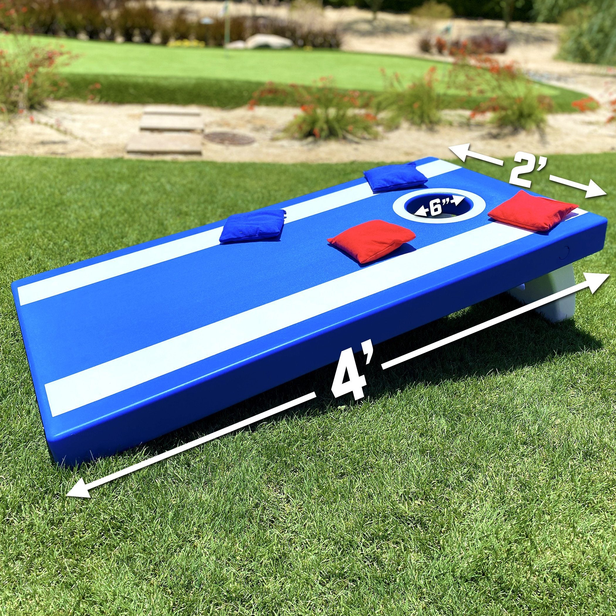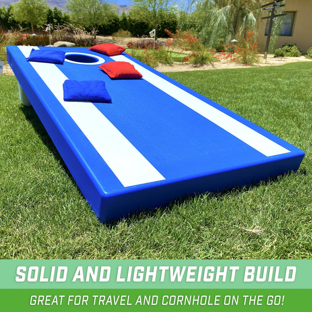 The GoSports All-Weather Cornhole game set was designed to provide for a superior cornhole experience by maximizing durability, portability, and game quality. The 4 ft x 2 ft boards are full regulation size for authentic gameplay, but they are made from durable yet lightweight hard plastic to make them portable. Premium materials help make this set a leader in the cornhole market in terms of durability and price. The set also includes 8 all-weather duck cloth bags, not the cheap sand filled bags other companies use that feel like bricks. Our boards are also unique in that the base leg folds in for easy portability/storage, but this does not affect gameplay in any way. All the bags can be stored inside the folded boards when not in use. Choose from our fun patriotic American Flag design, or classic Red and Blue designs.