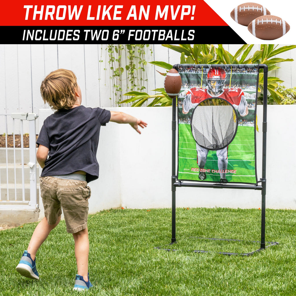 Nurture a love of sports early on! GoSports Red Zone Challenge allows young kids to develop basic throwing mechanics and build their confidence. This football throwing game is over 3.5 ft tall and features an oversized target area so it's easy to play for beginners. The included youth sized footballs are small enough for kids' hands and light enough for both indoor and outdoor gameplay. The football toss target is simple to set up with no tools required, making it convenient for any parent. With multiple fun ways to play, it's a great gift for both boys and girls! Let the football fun begin with GoSports Red Zone Challenge!