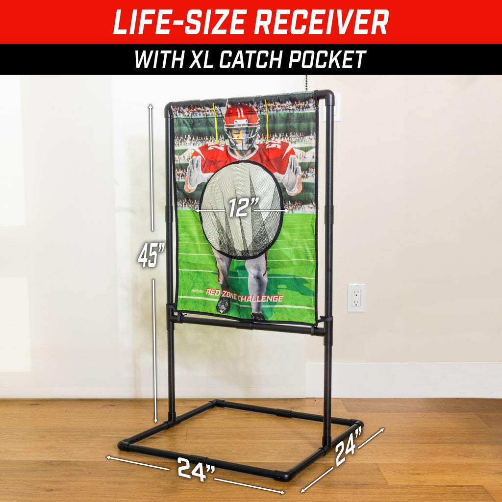 • QB IN TRAINING: Fun and exciting way for kids to practice throwing touchdown passes; The receiver target is over 3.5 ft tall with a large 12 inch catch pocket for life-size football excitement; Includes 2 (6 inch) inflatable footballs and a ball pump
