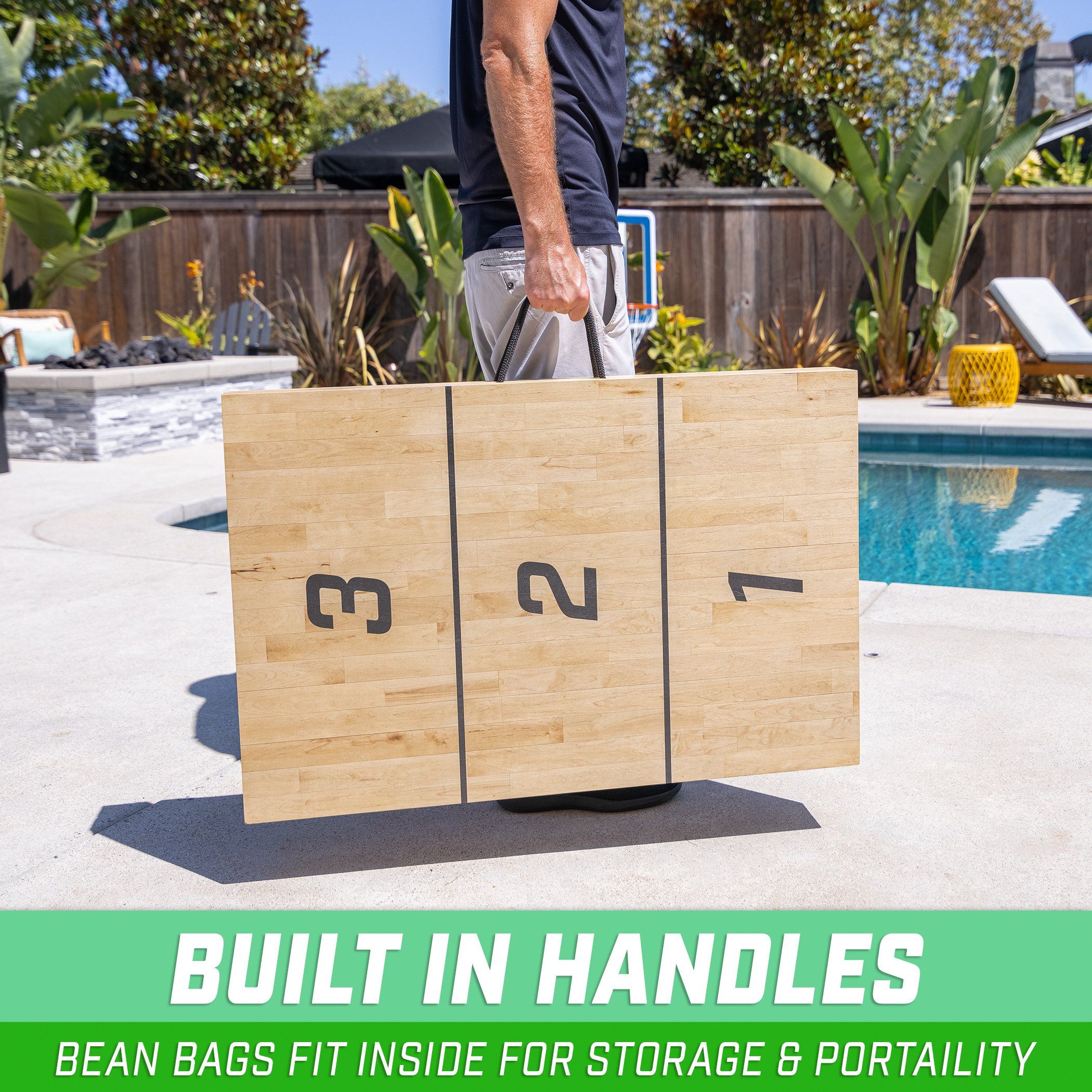 - FOLDABLE & PORTABLE: Board folds out instantly for play and can be folded closed for storage with an area to store the bean bags inside when folded; Handles are built-in for ultra portability when folded